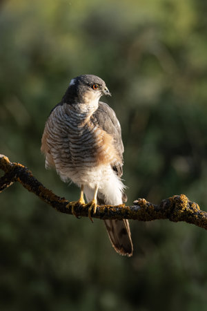 Eurasian sparrowhawk (Accipiter nisus), also known as the northern sparrowhawk or simply the sparrowhawk, is a small bird of prey in the family Accipitridae. Perched on branch. Wildlife scene of European nature. Netherlands.