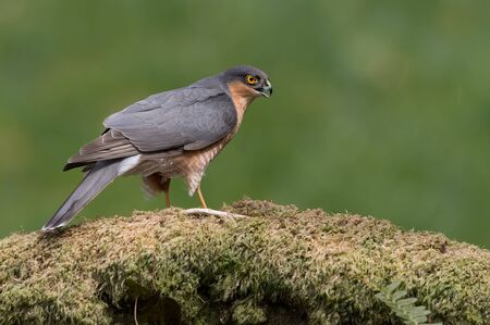 Close up of an adult male Eurasian Sparrowhawk (Accipiter nisus) perching on a mossy log, Scotland.