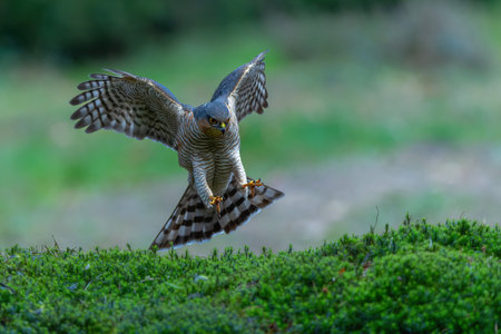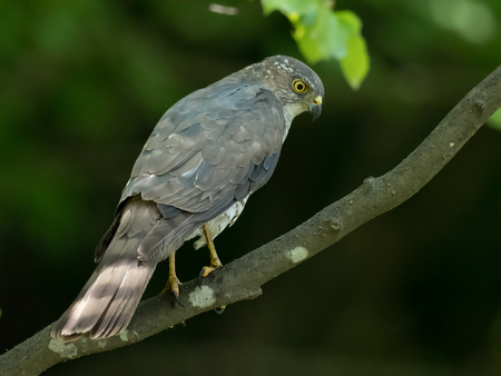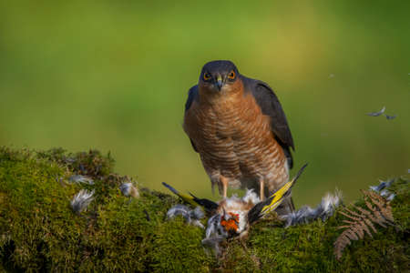 Eurasian Sparrow hawk (Accipiter nisus) in the forest of Noord Brabant in the Netherlands. Green bokeh background. Looking into the camera.