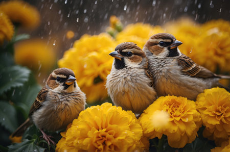 Three sparrows sitting on a bouquet of yellow flowers in the rain