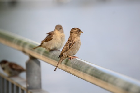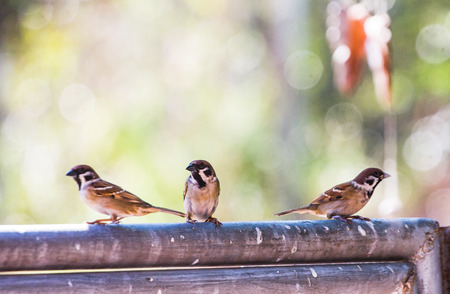 Little sparrows sitting on the fence. Selective focus.