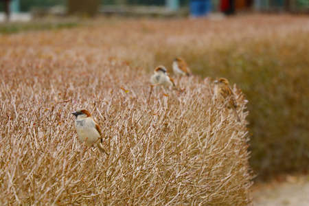 Out of focus. Blurred background. Sparrows are sitting on a bush