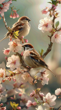 Two charming sparrows sit on a delicate branch adorned with blossoms. The soft background creates a serene and tranquil atmosphere, ideal for nature lovers.