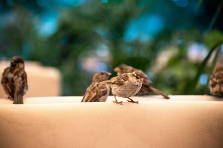 Urban sparrows in a cafe on the table.