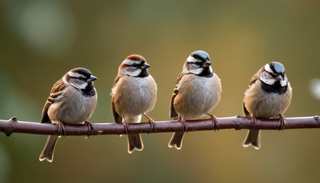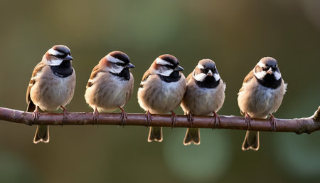 A row of cute sparrows perching on branch generated by artificial intelligence generated by artificial intelligence