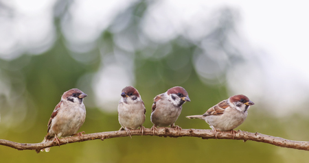 Group of Sparrows (Passer montanus) perched on a branch