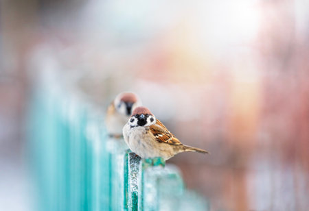 Sparrows on the fence in winter close-up.