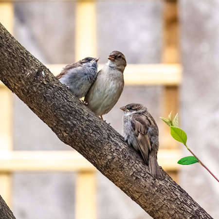 beautiful nature background with funny little Chicks of a bird a Sparrow standing on a branch in Sunny Park