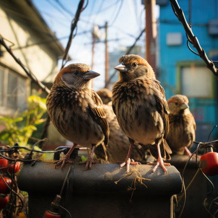 sparrows fluttering in a paved urban lot, created with generative ai