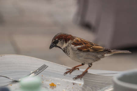 Closeup of sparrow standing on wooden chair at the bar terrace in the street