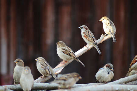 STREET brown sparrows perch on a branch, birds in the thick branches of an acacia tree. Wild and free nature. photo animalism. artistic blurring