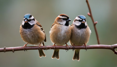 Four sparrows with clear black and white head patterns are lined up neatly on a thin branch, their bodies facing forward against a muted background.