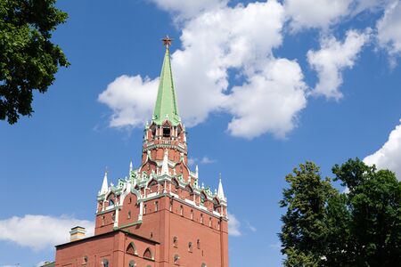 Troitskaya tower of Moscow Kremlin on a blue sky background in sunny summer day. The Trinity or Troitskaya Tower