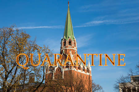 Coronavirus in Moscow, Russia. View of Kremlin (day). Quarantine sign. Concept of COVID pandemic and travel.
