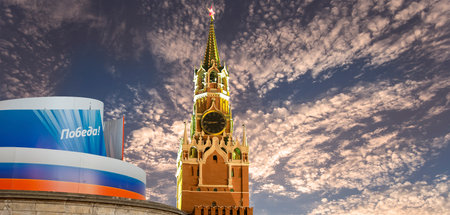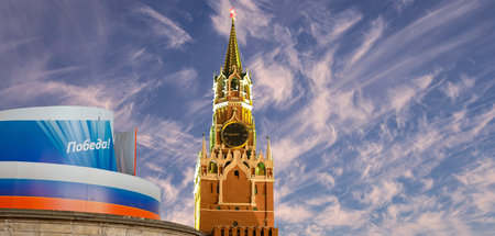 National flag of Russia against Troitskaya Tower of the Moscow Kremlin with a red star at top of a spire and blue sky