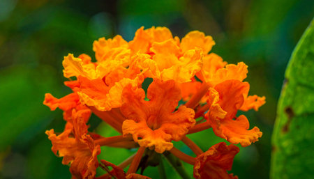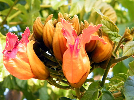African tulip tree flower. Orange petals closeup among green leaves