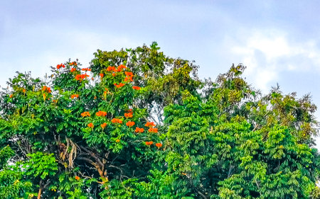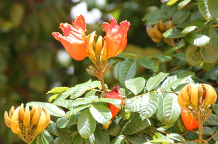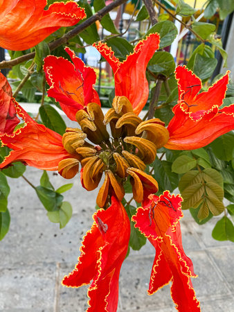 The African tulip tree (Spathodea campanulata). Colorful flowers in the Oaxaca region of Mexico.