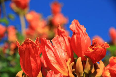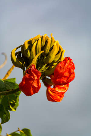 Spathodea campanulata flower on a blue background in Or Yehuda, Israel