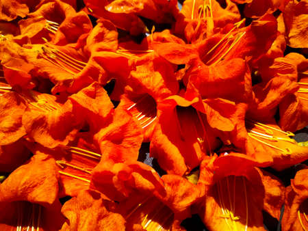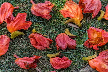 Spathodea campanulata or fountain tree flowers on the ground