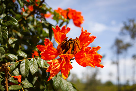 Spathodea campanulata (Kiacret, African tulip, fountain tree, pichkari, Nandi flame, World's Worst invaders, Nile flame, squirt tree, tulip tree, Uganda flame, Flame of Thika) with natural background