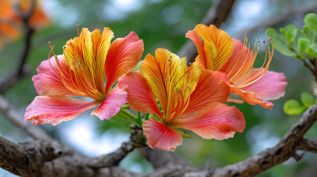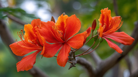 Beautiful tropical orange flowers on tree, exotic garden in Spain