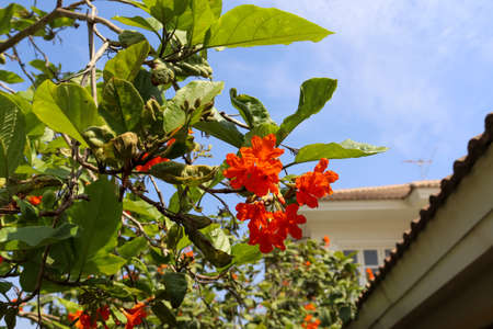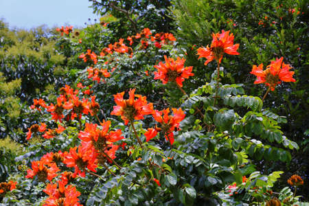 Spathodea campanulata is commonly known as the African tulip tree with red flowers (family Bignoniaceae) growing on street of Funchal, Madeira island.