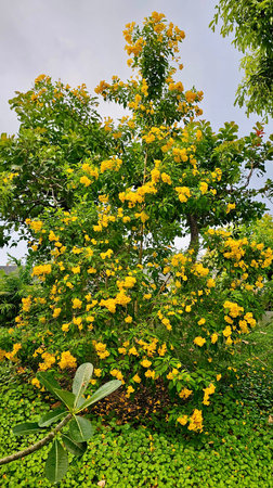 Beautiful yellow trumpet tree in garden at Chiang Mai, Thailand