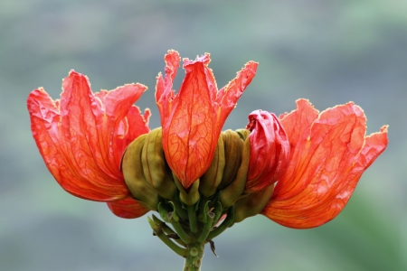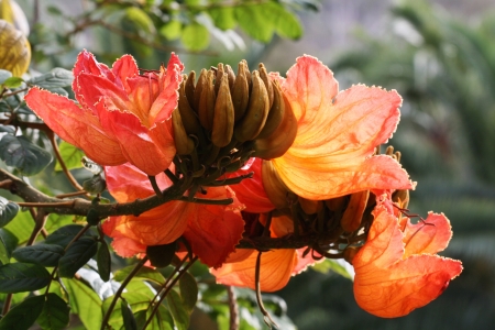 Spathodea campanulata, African tulip tree, Fountain tree, Nandi flame, ornamental tree with orange-red bell shaped flowers, flower buds ampule shaped and carry water.