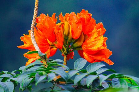 Blooming orange African Tulip flower or Spathodea campanulata or Fountain tree or Flame of the forest with green leaves against the blue sky.