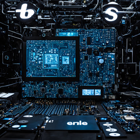 Intricate circuit board featuring microchips and glowing blue lights, symbolizing advanced technology and digital innovation in modern electronics design.