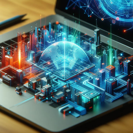 Laptop with abstract glowing digital city hologram. Technology concept. 3D Rendering