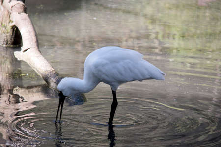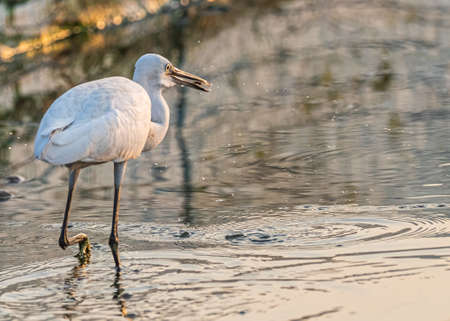 White Eurasian Spoonbill Platalea leucorodia in the pond in beautiful sunlight.