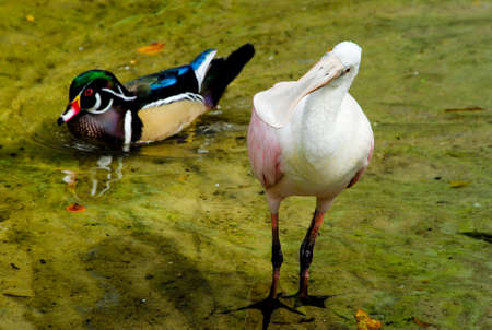 A Roseate Spoonbill with a Wood Duck swimming in background out of focus
