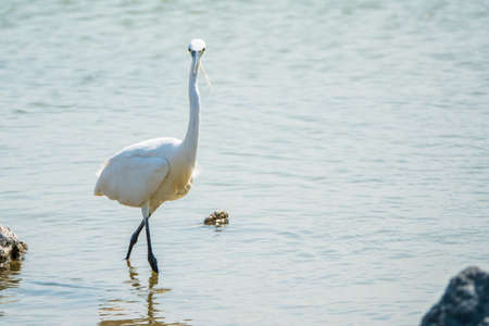 The small white heron or Little egret stands in the lake. Small White Heron, lat. Egretta garzetta, looking at fish in shallow water