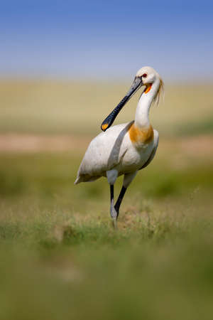 Eurasian Spoonbill (Platalea leucorodia) standing in the grass