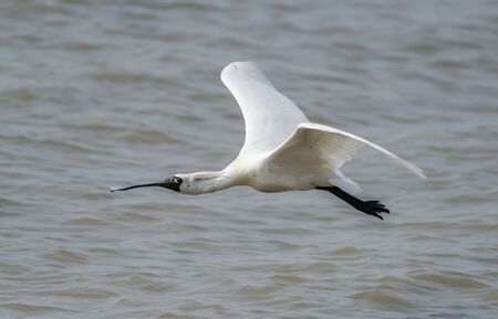 Black-faced Spoonbill flying in waterland