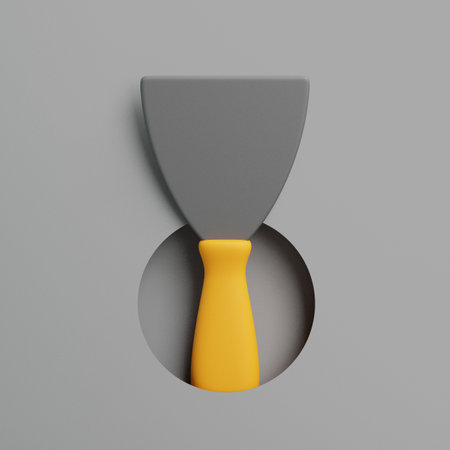 3D render of a gray putty knife with a yellow handle on a gray background. Minimal construction tool concept