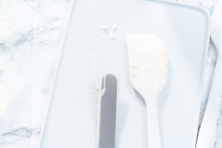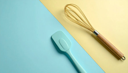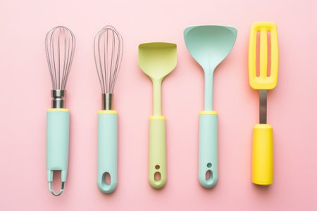 flat lay of kitchen tools on a pastel surface, created with generative ai