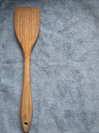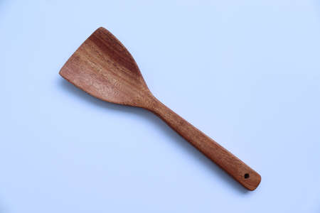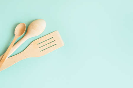 Wooden spatula for cooking on blue background. Kitchen concept, minimalism