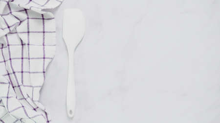 Green cooking silicone spatula isolated on white backgrounds. New rubber spatula with plastic handle for confectionery, bakery and pastry. Heat resistant kitchenware tool device. Top view.