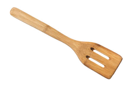 Hand holding wooden spade, spatula or flipper for frying pan on white background