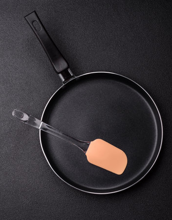 An empty black metal frying pan, kitchen utensils for cooking. An empty frying pan as a backdrop for your design.