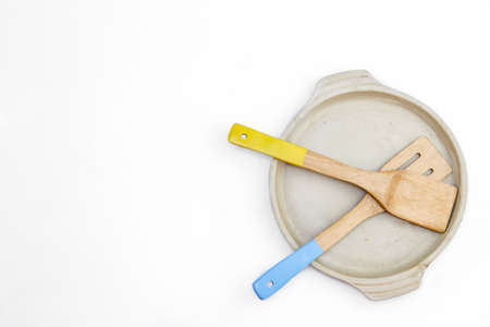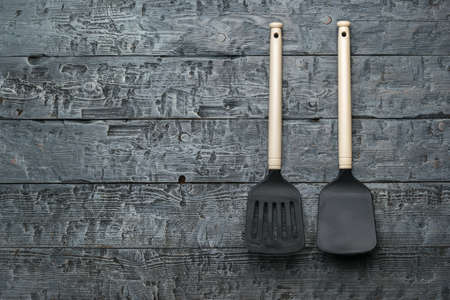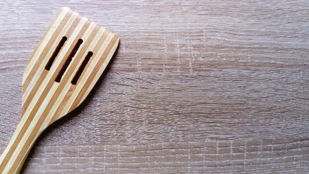 wooden skimmer and spatula, kitchen tools on the table with copy space
