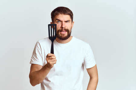 man with cooking shovel and white t-shirt close-up cropped view emotion gesturing with hand