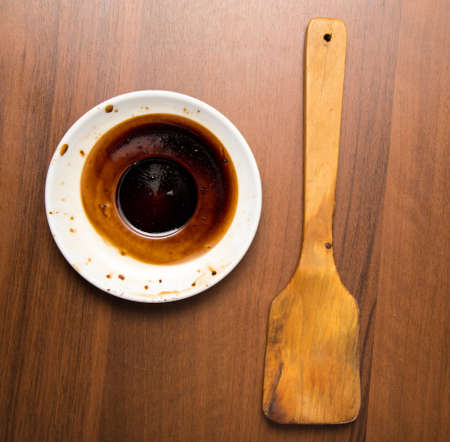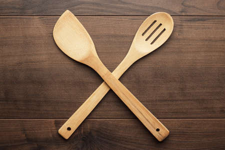 Wooden spoon for kitchen appliances isolated on wooden background closeup.