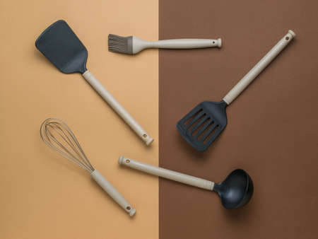 A set of kitchen accessories on a two-color background. Plastic kitchen tools. Flat lay.