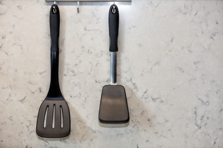 Two kitchen spatulas with beige handles on a wooden background. Kitchen appliances.