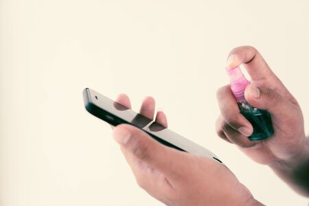 Hand is holding spraying bottle 70% alcohol on smartphone to prevent Coronavirus or Covid-19.