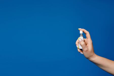 Hygienic spray for disinfection in a neat female hand with manicure isolated on a blue background with copy space. Hand sanitizer in tidy female hand. Hygiene advertisement shot
