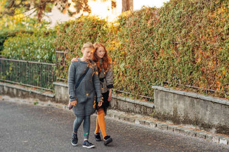 Group of two funny preteen girls walking outside, fashion for children. Kids wearing grey pullover and check jacket